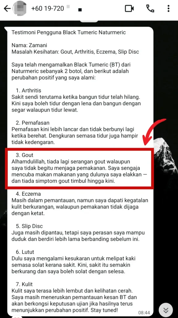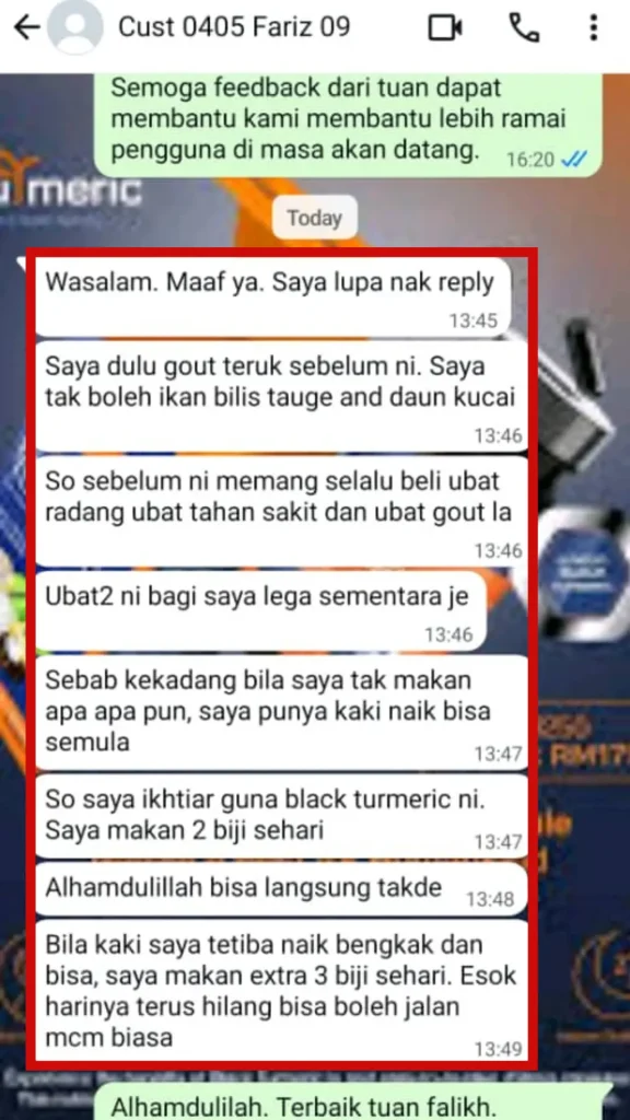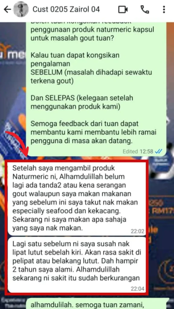 “Alhamdulillah… walaupun dah langgar pantang.. makan seafood, kekacang… Sejak amal Naturmeric.. Dah tak kena serangan gout… Lutut yang sakit dah 2 tahun pun dah kurang sekarang.“