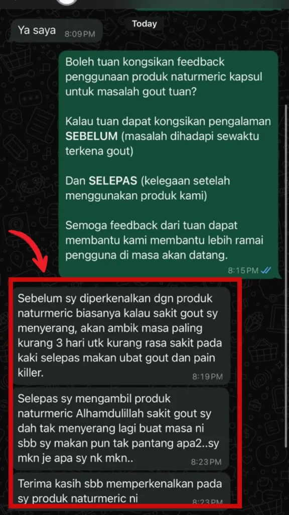 “Gout sebelum ni teruk. Memang selalu makan ubat radang, ubat tahan sakit, ubat gout. Tapi elga sementara je. Alhamdulillah..lepas guna Naturmeric bisa hilang, langsung takde. Bengkak cepat surut.“