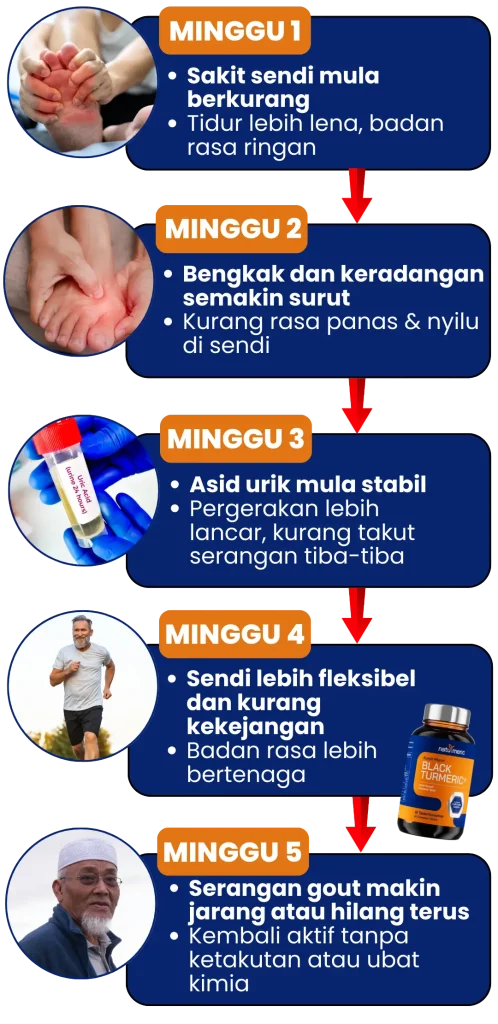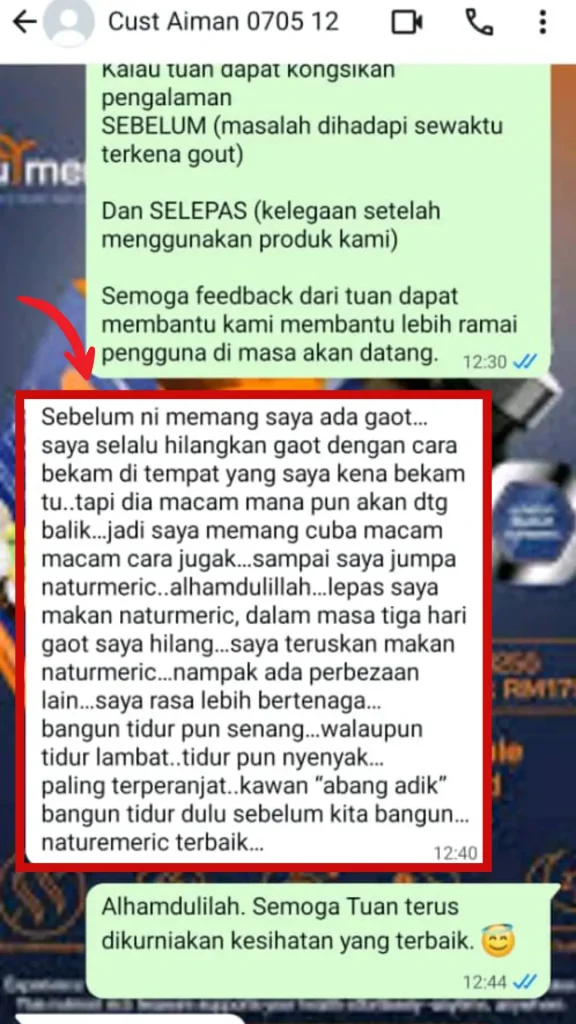 “Setiap bulan kena serangan gout, sampai terpaksa MC dan jalan pun terhencut. Dah cuba ubat hospital bertahun-tahun tapi tetap berulang. Lepas amal Naturmeric, minggu pertama dah kurang sakit. Masuk minggu ketiga, jari kaki tak bengkak lagi. Sekarang dah 3 bulan bebas serangan!”