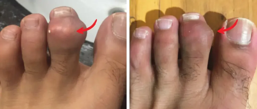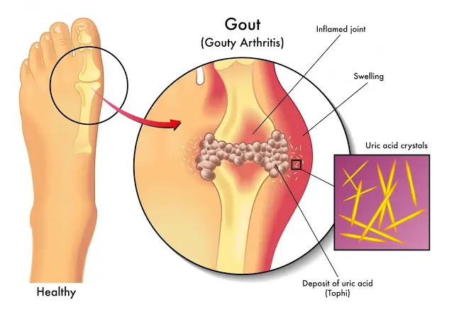 Gout berlaku bila kristal asid urik terkumpul di sendi. Sistem imun menganggapnya sebagai ancaman dan mula menyerang, lalu terbentuklah bahan radang seperti sitokin & prostaglandin.