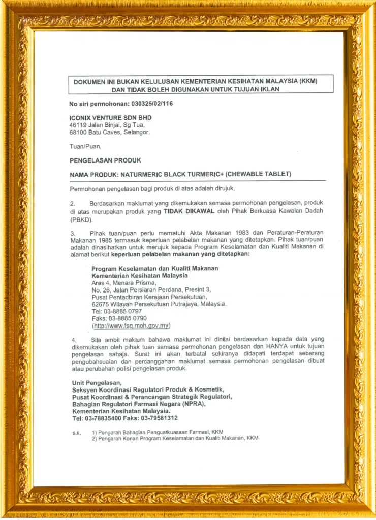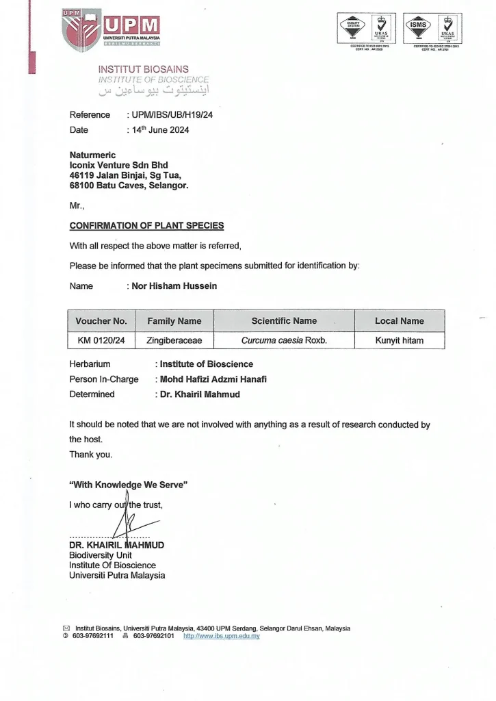 Produk Naturmeric yang sedang kami bangunkan ini telah disahkan 100 peratus mengandungi kunyit hitam tulen oleh Universiti Putra Malaysia.