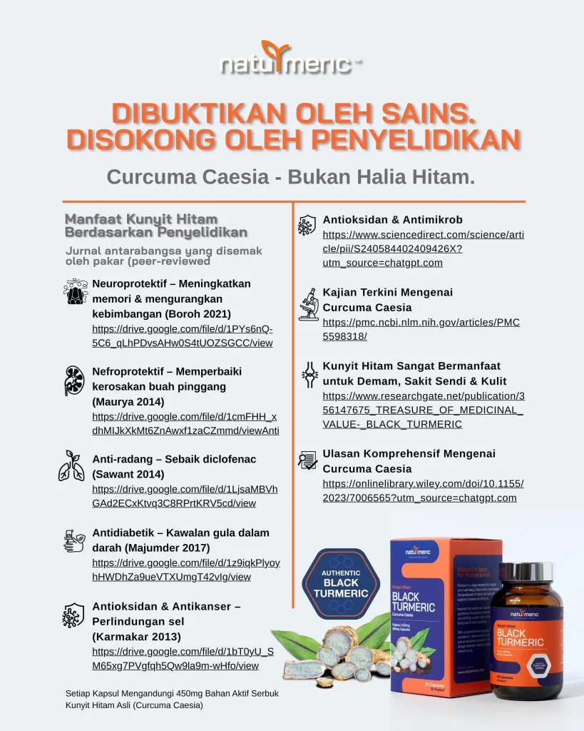 NATURMERIC adalah suplemen kesihatan berasaskan ekstrak Black Turmeric (Kunyit Hitam Asli yang telah disahkan oleh University Putra Malaysia,UPM), Herba yang jarang ditemui dan bernilai terlalu tinggi yang kaya dengan curcuminoid dan antioksidan untuk merawat keradangan, rawatan sakit sendi, dan pelbagai masalah kesihatan secara semula jadi.